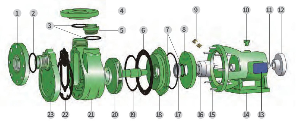 Nhà máy của chúng tôi chuyên sản xuất máy bơm ly tâm và máy bơm tự mồi chống ăn mòn hoàn toàn bằng nhựa bằng hai vật liệu - PVDF và FRPP - trên bốn dòng (FV, FP, FVZ, FPZ). Bơm PVDF thích hợp để xử lý axit mạnh, chất oxy hóa mạnh, halogen, hydrocacbon thơm, hợp chất béo và dung môi clo hóa, với phạm vi nhiệt độ hoạt động từ -40°C đến 140°C. Máy bơm FRPP lý tưởng cho các chất kiềm mạnh cũng như axit, bazơ, muối và các dẫn xuất của chúng nói chung, với dải nhiệt độ hoạt động từ -40°C đến 90°C. Máy bơm thường được điều khiển bởi động cơ loại Y tiết kiệm năng lượng. Động cơ chống cháy nổ có thể được cung cấp theo yêu cầu.